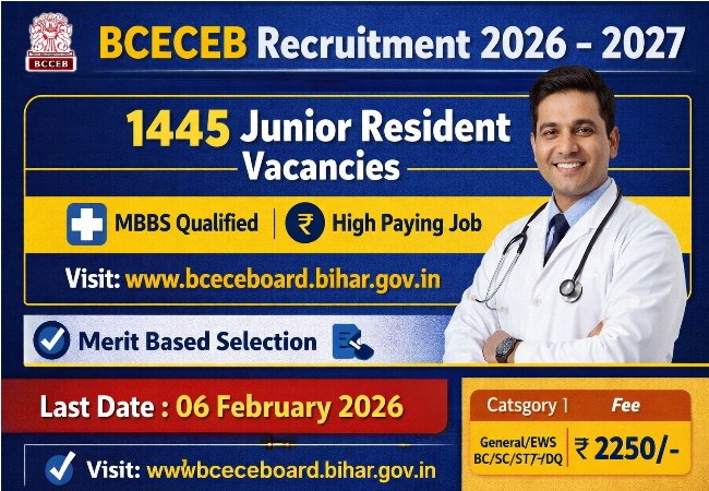 ConclusionBCECEB भर्ती 2026 Bihar के Medical Candidates के लिए एक Excellent Government Job Opportunity है। इस भर्ती के तहत Junior Resident के 1445 पदों पर भर्ती की जा रही है, जिसमें ₹65,000 Per Month Salary दी जाएगी। अगर आप MBBS Qualified Doctor हैं और Bihar में Government Medical Job करना चाहते हैं, तो यह भर्ती आपके Career के लिए बहुत ही Beneficial साबित हो सकती है। Application Process पूरी तरह Online है और Selection Merit List Based होगा, जिससे यह भर्ती और भी आसान बन जाती है। इसलिए सभी Eligible Candidates को सलाह दी जाती है कि वे Last Date (06 February 2026) से पहले आवेदन जरूर करें और Official Notification को ध्यान से पढ़ें।Junior Resident |