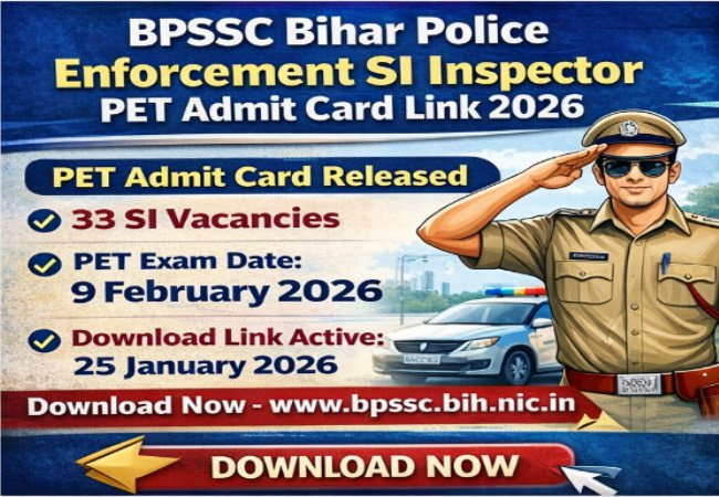 Bihar Police Subordinate Service Commission (BPSSC) ने Bihar Police Enforcement Sub Inspector (SI) भर्ती से जुड़ा हुआ PET Admit Card Link 2026 जारी कर दिया है। यह भर्ती Transport Department के अंतर्गत 33 Posts के लिए निकाली गई थी।इस भर्ती के लिए online applications 30 May 2025 से 30 June 2025 तक स्वीकार किए गए थे। इसके बाद candidates ने Prelims और Mains Examination में हिस्सा लिया। अब जो उम्मीदवार mains exam qualify कर चुके हैं, उनके लिए अगला चरण है Physical Efficiency Test (PET), जो कि 09 February 2026 को आयोजित किया जाएगा।जो भी उम्मीदवार इस mains examination में appeared हुए थे, वे अब अपना BPSSC Bihar Police Enforcement SI PET Admit Card 2026 नीचे दिए गए official link से download करे