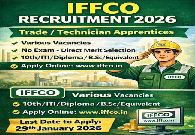 IFFCO भर्ती 2026 उन सभी candidates के लिए एक excellent opportunity है जो बिना exam के Apprenticeship Training के जरिए government sector में entry लेना चाहते हैं।10वीं पास से लेकर ITI, Diploma और B.Sc candidates तक सभी के लिए यह भर्ती खुली है, जो इसे और भी ज्यादा inclusive और attractive बनाती है।Merit-based selection, recognized PSU training और skill development का मौका इस recruitment को खास बनाता है। अगर आप eligible हैं, तो आपको 29 January 2026 से पहले अपना online application जरूर submit करना चाहिए। यह apprenticeship आपके career की एक strong foundation बन सकती है, जिससे future में better job opportunities के doors खुल सकते हैं।